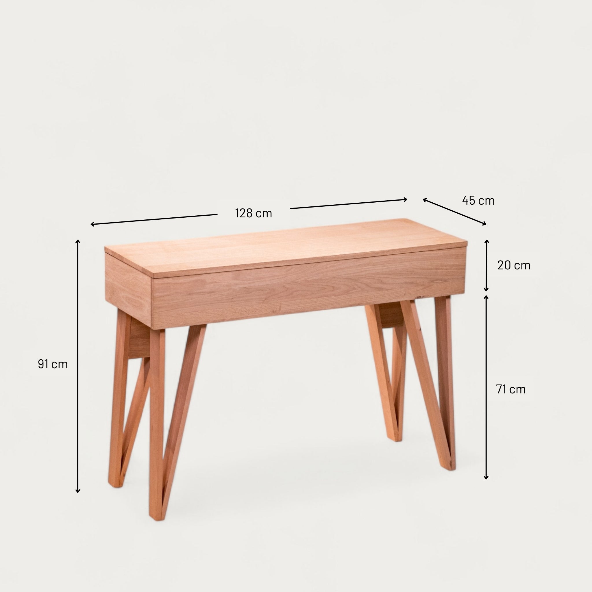 Fermé, c’est une console esthétique et discrète (45 cm de profondeur) dans laquelle on peut ranger un ordinateur portable, des dossiers, un clavier...