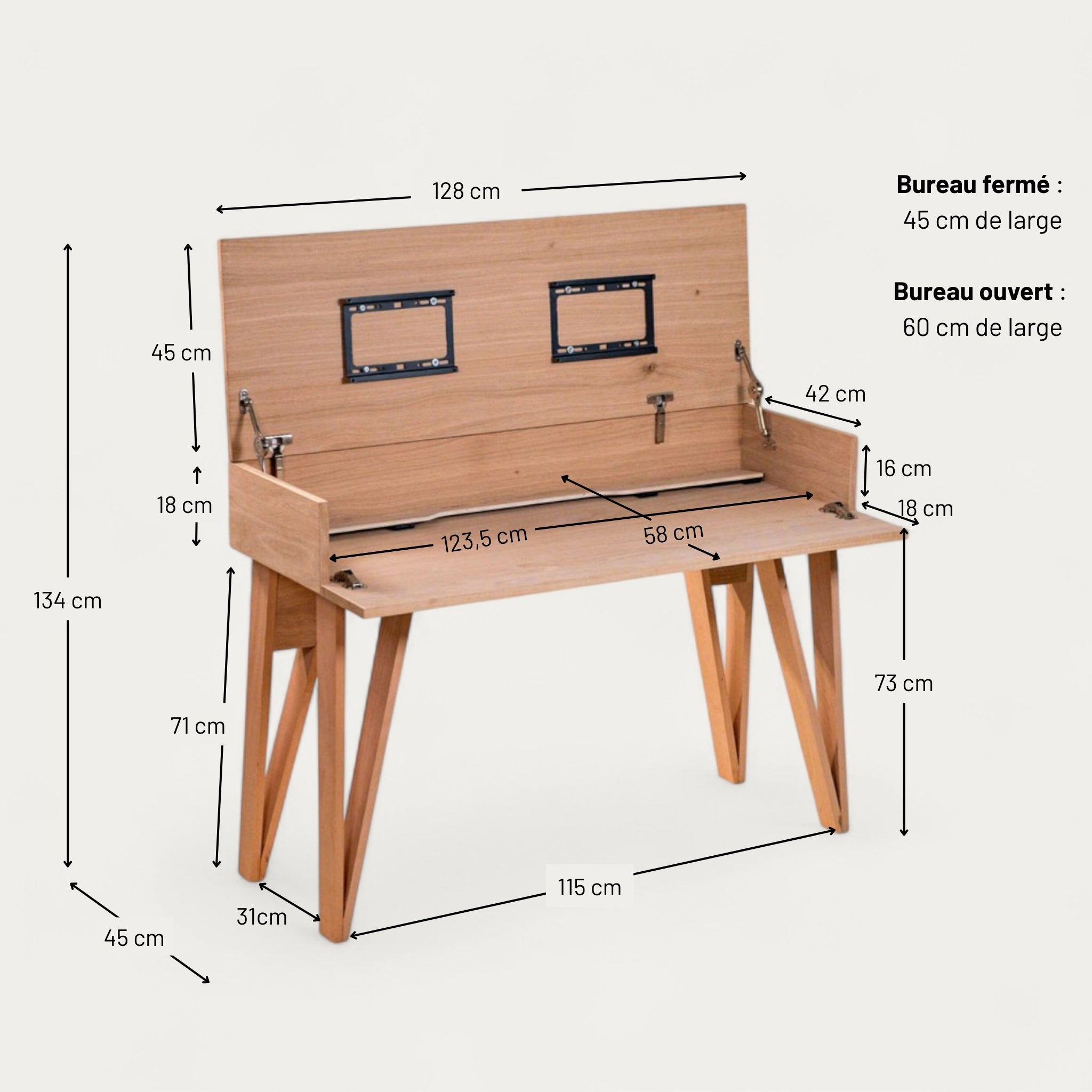 Ouvert, c’est un véritable poste de travail (125 x 60 cm), adapté pour travailler avec 2 écrans ou 1 grand écran selon vos préférences, optimisé pour votre posture (distance des écrans recommandée par les professionnel de santé)