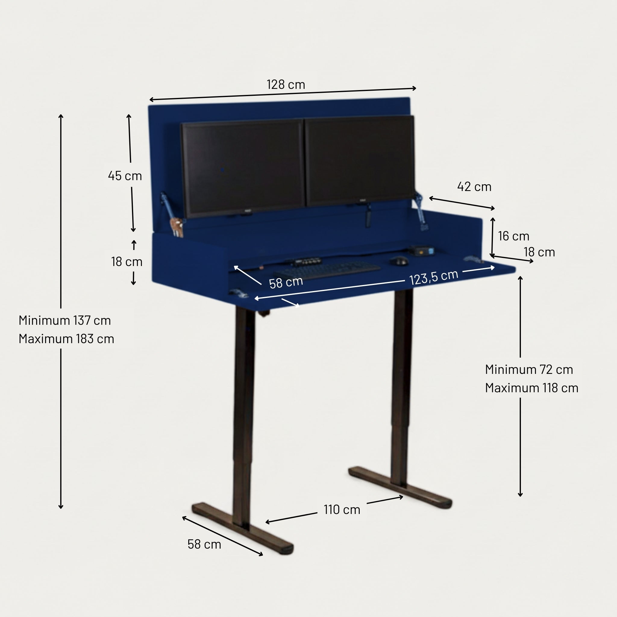 - Ouvert, il devient un poste de travail complet de 128 cm de long et 60 cm de large, idéal pour installer deux écrans ou un grand écran avec vos accessoires.